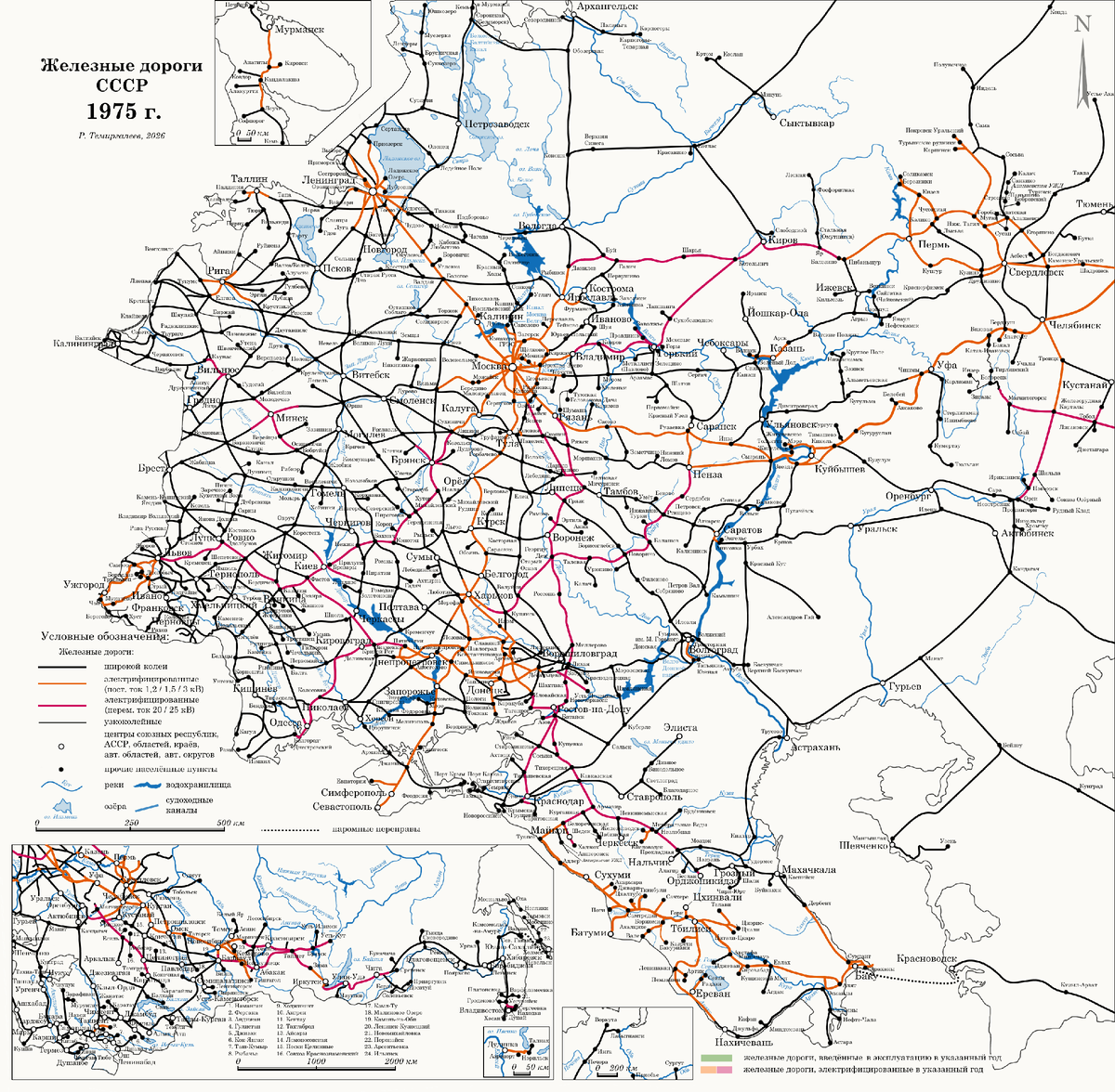 С учётом исправлений неточностей и ошибок, допущенных в прошлых частях (см. раздел «Работа над ошибками» в конце публикации), к концу 1975 года карта железных дорог СССР выглядела следующим образом.