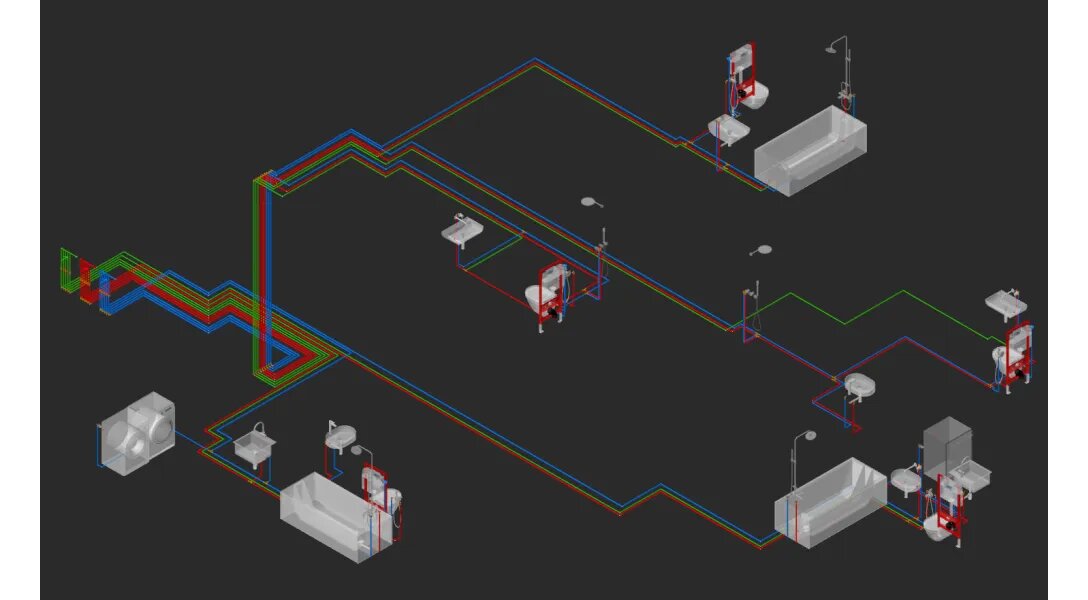 В сложных объектах, например, в доме повышенной комфортности площадью около 800 м² с несколькими санузлами на этаже, компания делает ставку на полноценную 3D-модель инженерных систем. В одном проекте формируется разветвленная сеть канализации, холодного и горячего водоснабжения и рециркуляции, а затем эта модель используется в работе с монтажниками.