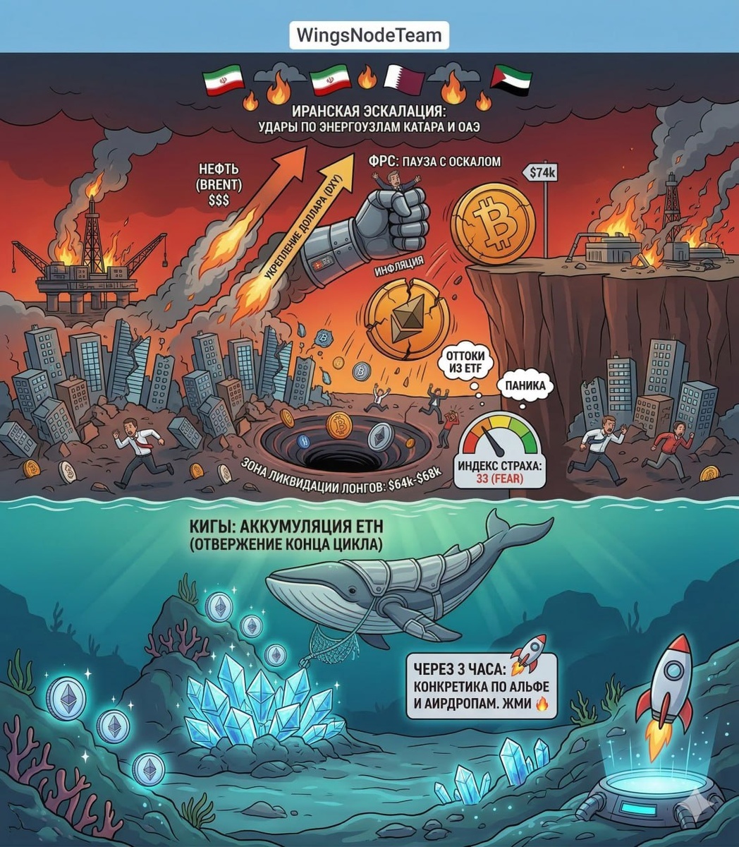 ? Сегодня 19 марта 2026 года, и крипторынок снова доказывает: мы больше не в вакууме. Последние 5 дней стали настоящим испытанием для холдеров. Разбираем по фактам. 🚨 Геополитический огонь Удары по энергетическим узлам Катара и ОАЭ - это не просто новости. Это прямой удар по мировой инфляции. Нефть летит вверх, доллар укрепляется, а рынки закладывают стагфляцию. Геополитика из "шума" превратилась в главный драйвер. 🕞 ФРС: Пауза с оскалом Вчера ФРС оставила ставку на уровне 3.5-3.75%. Но тон Пауэлла был предельно жестким. Рынки ожидали смягчения, но получили сигнал: "будем душить инфляцию, пока не посинеем". Результат - BTC откатился от $74k, не выдержав макро-пресса. 📉 Индекс страха - 33 (Fear) Толпа напугана. Мы видим оттоки из ETF ($129M из BTC и $55M из ETH за вчера). Ликвидность сейчас выступает как магнит: по картам ликвидаций, нас тянет в зону $64k-$68k. Там сидят самые жирные кластеры лонгов, которые рынку нужно "сбрить" перед реальным ростом. Куда смотрят киты? 🐳 Пока