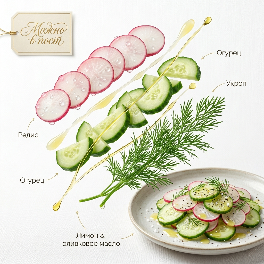Начнём с того, что буквально дышит жизнью. Этот салат — как пробуждение после долгой зимы: хруст редиса, сочная прохлада огурца, аромат укропа, будто с грядки. И никаких компромиссов — даже в пост вы получаете витаминный удар: 25 мг витамина С на 100 граммов, а ведь в редисе его вдвое больше, чем в апельсине!