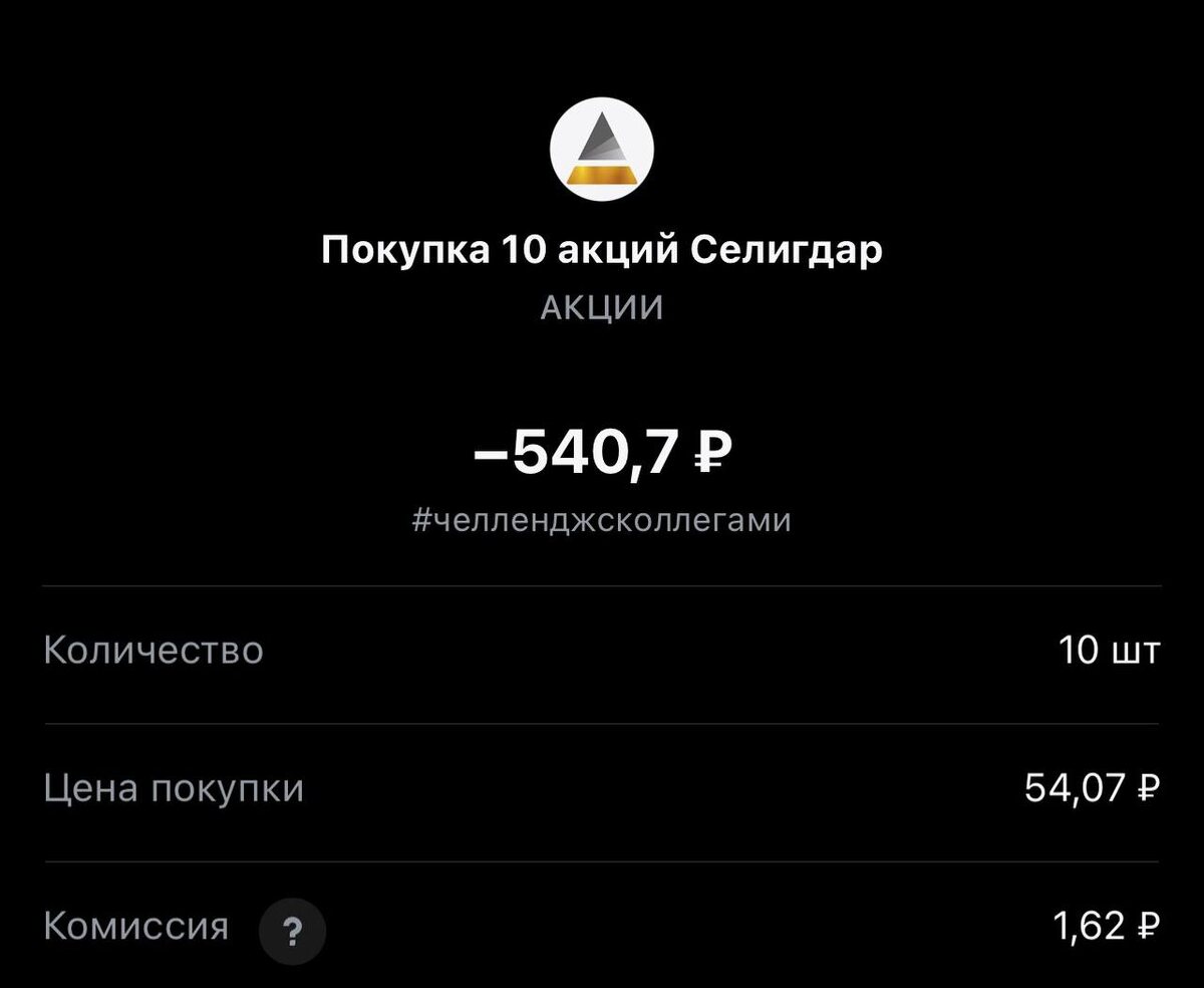 ! Сегодня покупка #382 с учетом оставшихся денег с прошлых сделок. Статистика портфеля на стороннем сервисе, можно посмотреть по "ссылке" Напомню это челлендж с коллегами, каждый рабочий день пополняем брокерский счет на 250 рублей и инвестируем. Если возникли вопросы или есть не понимание, что делать. Задавайте «тут» Покупка #382 🟢 "Селигдар" 54.07 rub #SELG 1 лот #каждыйсможет #челенджсколлегами TG MAX