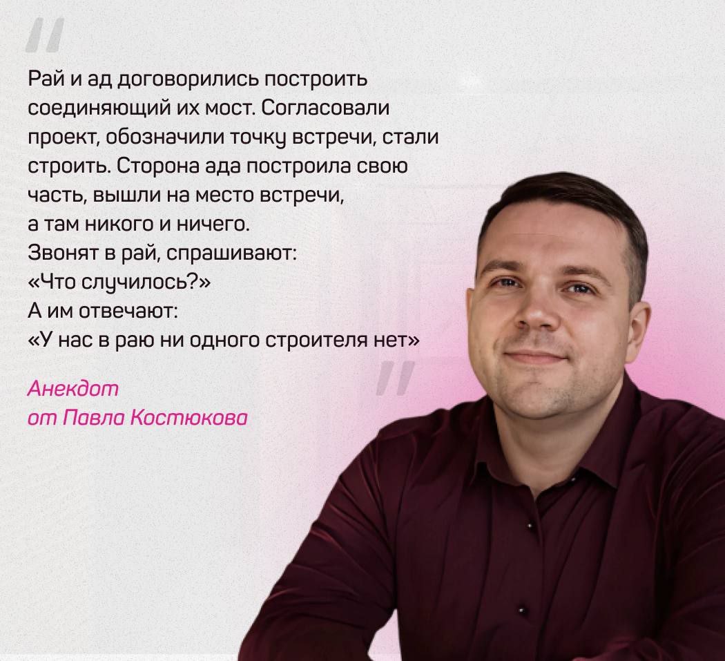 Это канал Павла Костюкова — предпринимателя, который давно работает в нише строительства, ремонта и обустройства. Он руководитель и сооснователь Инженерно-дизайнерской ремонтной компании Larsson И основатель бизнес-клуба T5 с 140+ участниками, среди которых большинство — строители, подрядчики и владельцы бизнесов смежных направлений. На канале — реальные диалоги. Всё, что мы переживаем в бизнесе каждый день. Ещё Павел публикует видеоразборы бизнес-ситуаций — они короткие, но по существу. Сразу видно, что человек сам прошёл через всё это, а не пересказывает чужие теории. Подписывайтесь и читайте авторский канал)