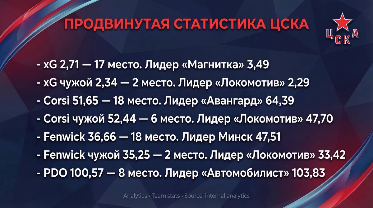 Отмечаем, что на отрезке последних 20 матчей по хG (ожидаемые голы) ЦСКА девятая команда Лиги с показателем 2,79. Результат corsi (сумма бросков в створ, мимо ворот и блокированных) на этом же отрезке остается идентичным, а по corsi соперника мы на третьем месте. Показатели fenwick (сумма бросков в створ и мимо ворот) как своего, так и соперника за последние 20 игр также остаются без изменений, а PDO (процент реализации бросков плюс отраженных бросков) падает до 11 места.