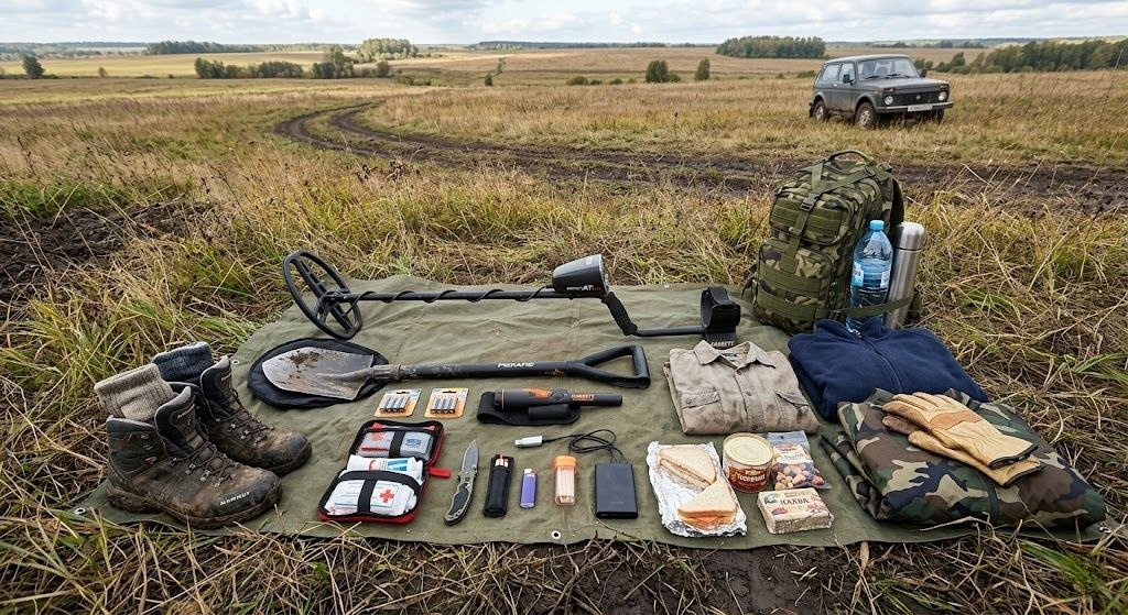 Ты купил металлоискатель, посмотрел видео и решил, что готов покорять поля. Чаще всего первый выезд выглядит так, человек приезжает, через час замерзает, хочет есть, у него промокли ноги, сел аккумулятор в приборе, а найденная пробка летит обратно в яму от злости. Чтобы твой первый раз не стал последним, прочитай этот чек лист. Речь пойдет не о вылазке на час в соседний лесопарк. Мы говорим о полноценном выходе в чистое поле. Дистанция от машины, ветер, солнце и полное отсутствие цивилизации. Вот что реально нужно иметь с собой. 1. Прибор и питание Металлоискатель собирается дома, а не на поле. Проверь соединения катушки и штекера. Самое важное это батарейки или аккумуляторы. Бери комплект с запасом ровно в два раза больше, чем планируешь потратить. На морозе или при активной работе заряд улетает за пару часов. Положить запасной комплект в рюкзак это правило, которое нельзя нарушать. 2. Обувь и ноги Самая частая боль новичка. Резиновые сапоги отличный вариант, если они удобные и по