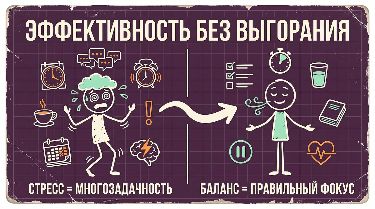 Для поддержания высокого КПД и успешной борьбы со стрессом эксперты рекомендуют сместить фокус с управления временем на управление собственной энергией,. Время считается лишь ресурсом, который можно обменивать на энергию, а именно уровень жизненной силы определяет вашу эффективность Ваш внутренний «аккумулятор» работает по определенным правилам, которые важно учитывать для сохранения продуктивности: Чтобы ваш «дуршлаг» перестал протекать, нужно выявить и устранить основные источники утечки жизненных сил: Физиология и правильное планирование помогают держать мозг в тонусе: Главным стимулом для поддержания высокой энергии остается наличие смысла или миссии. Когда вы занимаетесь любимым делом, которое приносит пользу другим людям, энергия приходит в процессе деятельности сама собой,,.