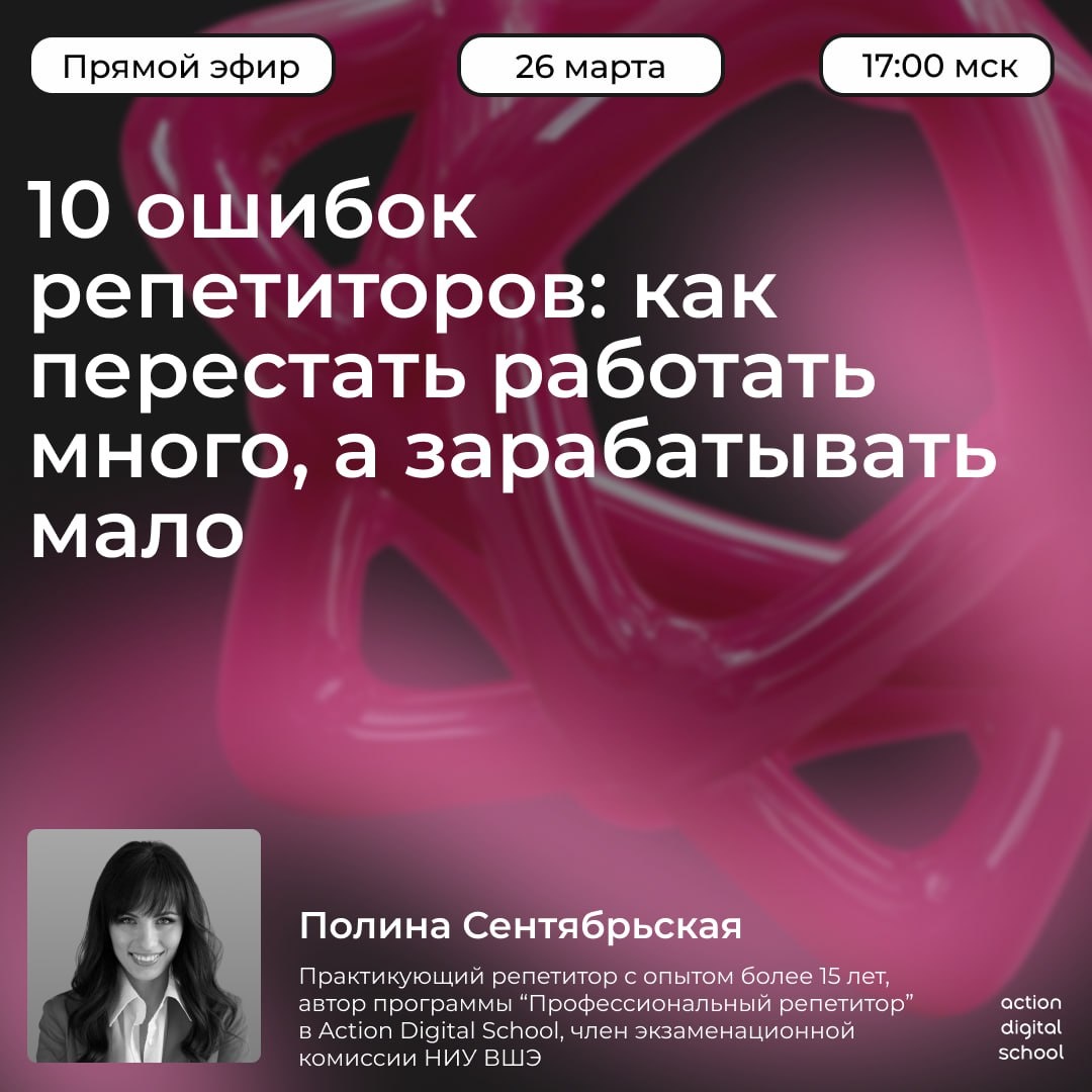 » 🗓 Когда: среда, 26 марта ⏰ Во сколько: 17:00 мск 📍 Где: онлайн Спикер: Полина Сентябрьская — практикующий репетитор с опытом более 15 лет, ментор репетиторов, член экзаменационной комиссии НИУ ВШЭ, автор программы «Профессиональный репетитор» в Action Digital School. На встрече в режиме реального времени Полина Сентябрьская расскажет: — почему репетиторы много работают, а зарабатывают меньше, чем хотелось бы — какие главные ошибки при поиске учеников совершают новички — как перестать быть «репетитором за 500 рублей» и выйти на ценник, который соответствует вашему опыту и знаниям — почему ученики уходят после 2-3 занятий и как выстроить систему, которая удерживает их на годы — где искать учеников: обзор топовых площадок 🎁 Все участники вебинара получат подарок — авторский гайд для репетитора: «Где искать учеников. Плюсы и минусы разных площадок». Зарегистрироваться на вебинар 👈