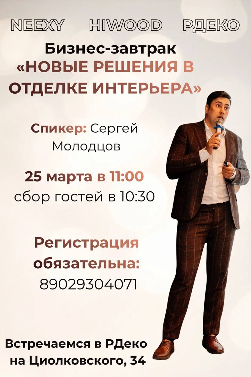 ☕️ Тема: «Новые решения в отделке интерьера». О чем поговорим? - Молодой бренд «Neexy» - интерьерные профили из латуни, алюминия и нержавеющей стали. - Обсудим интеграцию профилей в 3D панели, керамику и современные архитектурные решения. С нас — вкусный завтрак ☕️🥐 С вас — хорошее настроение и интересные вопросы. ⌛ Когда: 25 марта в 11:00. Сбор гостей — с 10:30. 📍 Где: салон РДеко, ул. Циолковского, 34 Регистрация обязательна: в личные сообщения @RDeco40 👈или по телефону 89029304071 📲