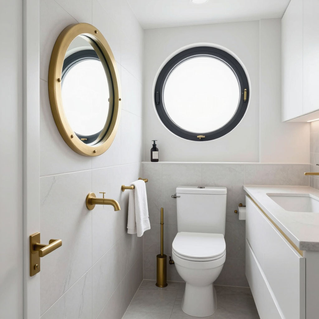 Это идеальное решение для маленькой ванной. Круглое окно визуально расширяет пространство, добавляет ему глубины. В сочетании с круглым зеркалом на противоположной стене дает потрясающий эффект.