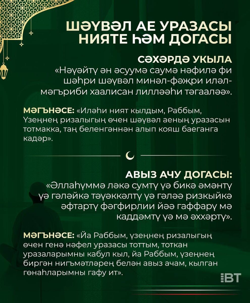 Бу айда мөселманнарга алты көн ураза тотарга киңәш ителә. Хәдисләрдән аңлашылганча, рамазан аенда фарыз уразасын тотып, аннан соң шәүвәл аеның алты көнен дә уразада уздырган кешегә бик күп савап языла 📌 ТУЛЫРАК 👇🏻 https://vatantat.ru/news/sauval-ae-baslana-any-nicek-uzdyryrga