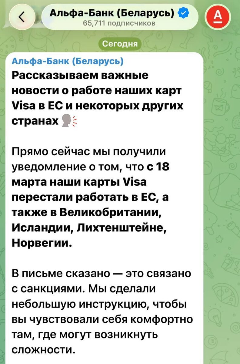 🇧🇾 Visa беларусского Альфа Банка с 18 марта перестали работать в странах ЕС, а также в Великобритании, Норвегии, Исландии и Лихтенштейне