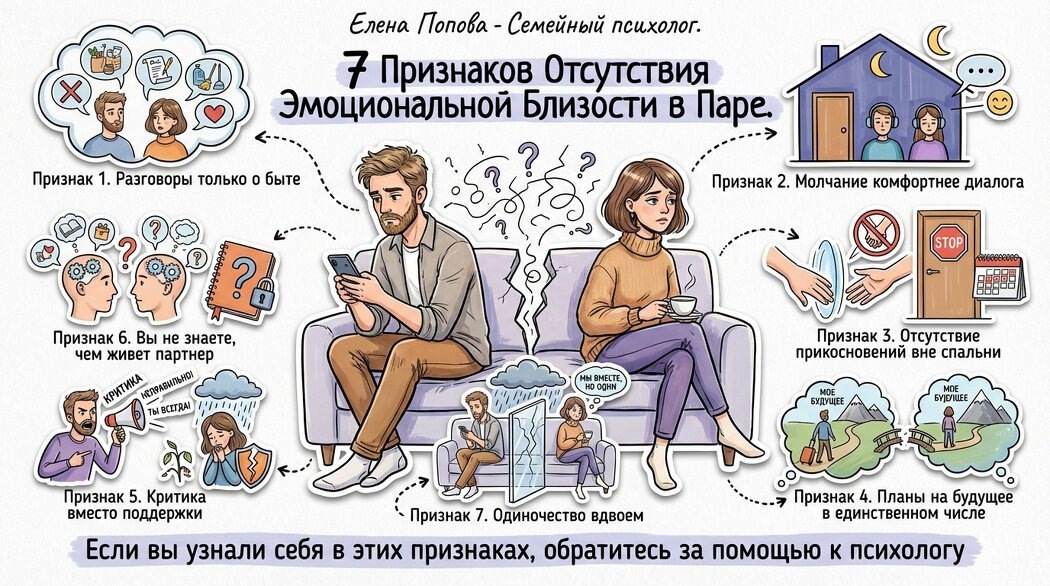 Знаете, это очень страшная сцена. Там не было ни ссоры, ни скандала. Там ничего не случилось, там была пустота. Два живых человека перестали существовать друг для друга. В статье расскажу о 7 признаках, по которым можно понять, что вы теряете эмоциональную близость - даже если внешне все нормально. Хорошая новос