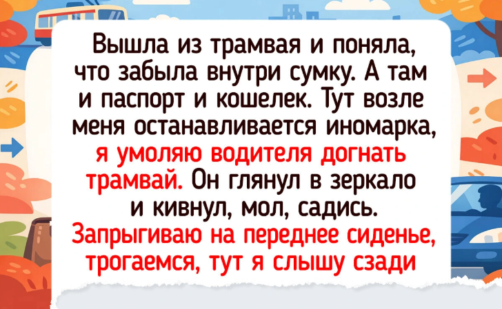 - Выхожу однажды из трамвая и понимаю, что забыла сумочку, а в ней всё: паспорт, кошелёк, документы! Тут возле меня останавливается иномарка, я умоляю водителя догнать трамвай на следующей остановке. Он глянул в зеркало и кивнул, мол, садись. Запрыгиваю на переднее сиденье, трогаемся, тут я слышу сзади: «Ничего, не переживайте, сейчас догоним». Оборачиваюсь, а там сидит очень представительный дяденька в элегантном костюме. Я понимаю, что это его служебная машина с личным шофёром! Начинаю смущённо извиняться, он опять меня успокаивает. Короче, трамвай мы догнали, я, выходя из машины, извинилась и поблагодарила и водителя, и седока. © Karina / Dzen