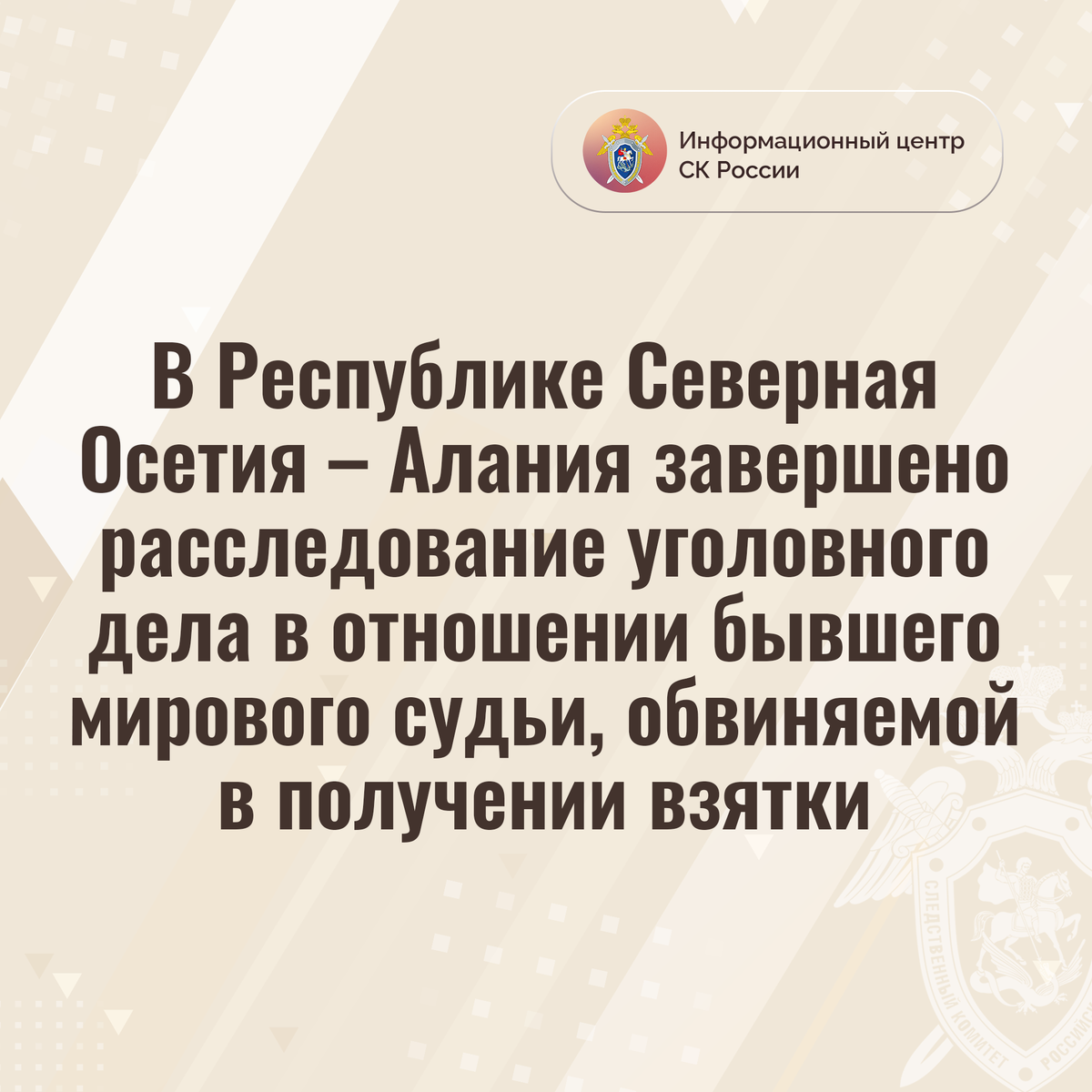 Следственными органами Следственного комитета Российской Федерации по Республике Северная Осетия-Алания завершено расследование уголовного дела в отношении бывшего мирового судьи. Она обвиняется в совершении преступления, предусмотренного ч. 4 ст. 290 УК РФ (получение взятки должностным лицом, занимающим государственную должность субъекта Российской Федерации).