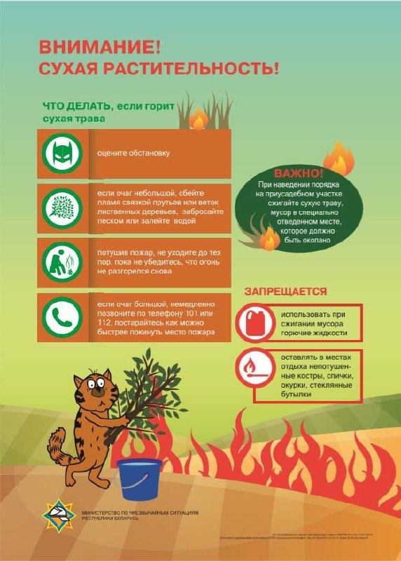 Чашникском районах 👨🚒Спасатели напоминают: выжигать сухую растительность категорически запрещено! Это не только опасно, но и влечет за собой административную ответственность. ☝️ Даже небольшая искра может привести к масштабному пожару.🔥 ♻️ Если вы планируете разжигать костер на своем участке, делайте это только в безветренную погоду и под постоянным контролем. Идеально использовать металлическую емкость, расположенную вдали от построек. Обязательно держите рядом средства тушения: ведро с водой 💧и лопату 👉 Помните: беспечность может привести к трагедии!