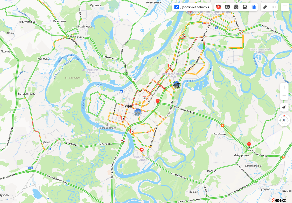 В Уфе сокращенный предпраздничный рабочий день стал причиной 8-балльных пробок. Заторы образовались уже к 17.00. По данным сервиса «Яндекс. Пробки», сильно затруднено движение на проспекте Октября – заторы начинаются от Центрального рынка и продолжаются до Горсовета. «Потолкаться» придется на улицах 50 лет СССР, Шафиева, Цюрупы, Революционной, Менделеева, Сагита Агиша и Маршала Жукова. Напомним, в честь праздника Ураза-байрам жителей Башкирии ждут трехдневные выходные.