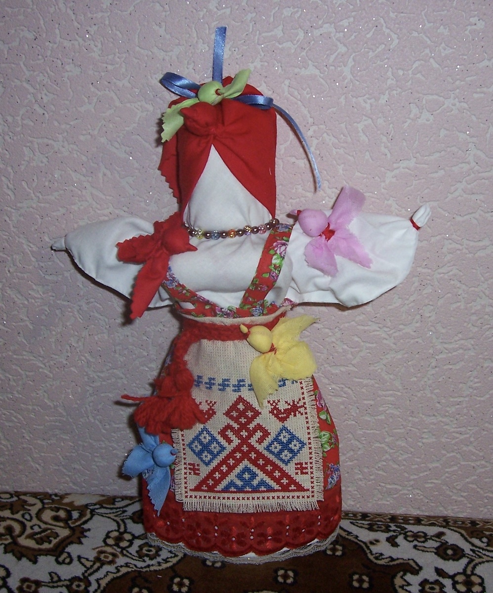 Кукла эта с конструктивной особенность. Основой куклы служит березовый столбик. Обматывается столбик новый белой тканью, чтобы кукла была «белолицей». Привязываю крепкую и большую скрутку из ткани символизируя грудь. (Большая грудь у всех славянских кукол — это символ плодородия). Головной убор у этой куклы напоминает птицу. На теле, голове, туловище куклы размещают так же птичек, сделанных из разноцветных лоскутков. Куклу делают нарядной, яркой.