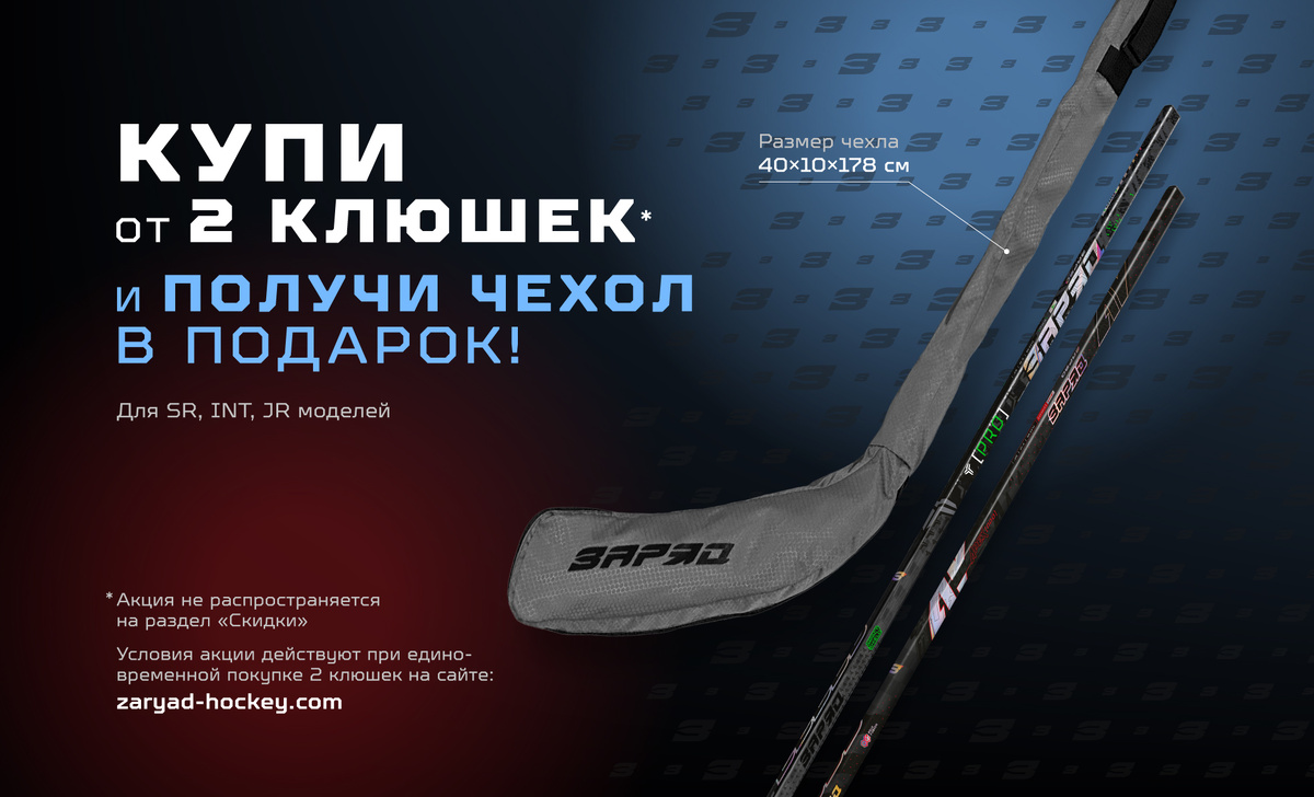 Успевайте получить чехол для хоккейных клюшек бесплатно по акции. Чтобы участвовать в акции, надо приобрести две или более хоккейные клюшки «ЗаряД». Заказ необходимо оформить одновременно в одной корзине на официальном сайте компании. Чехол добавляется автоматически и отправляется в доставку вместе с клюшками. В акции участвуют клюшки из основного раздела сайта. Не принимают участие следж-клюшки, клюшки для вратарей, а также товары, указанные в разделе «Скидки». Не суммируется с другими специальными предложениям. Чехол — это аксессуар, призванный защитить хоккейные клюшки во время транспортировки и хранения, а также обеспечить удобство их переноски. Защищенные клюшки служат дольше, сохраняя свои игровые характеристики. Чехол для клюшек «ЗаряД» выполнен из высокопрочных материалов, имеет устойчивость к износу и к повреждениям, защищает от влаги. Позволяет легко и безопасно перевозить клюшки, как на тренировку, так и в дальние поездки. В чехле присутствует система регулировки по ширине и