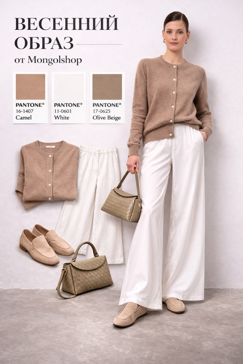 Продолжим тему кардиганов из лёгкого кашемира. Ведь лёгкий кашемир просто создан для межсезонья и свежих летних вечеров. Что это значит? Это изделия из тонкой нити с деликатной плотностью вязки. Они сохраняют природную терморегуляцию кашемира: материал дышит, не перегревает и мягко удерживает тепло, когда это нужно. Поэтому такой кардиган можно носить как самостоятельный верх — вместо жакета или лёгкой куртки — или как второй слой поверх топа, рубашки или платья. Сегодня в нашем образе — кашемировый кардиган и брюки в сочетании бежевого и белого. Это одна из самых элегантных цветовых пар. Чистота белого подчёркивает бархатистость бежевого, а бежевый делает белый ещё более свежим и выразительным. С точки зрения психологии цвета это тоже неслучайно: бежевый ассоциируется со спокойствием, утончённостью и внутренним балансом, а белый — с чистотой и совершенством. Вместе они создают ощущение лёгкости и уверенности без лишней строгости. Лёгкий кашемир — это комфорт, который не бросается