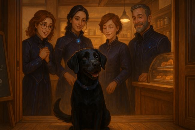 В тот день наши знакомые техноведьмы решили встретиться в своем любимом кафе. А любили они это кафе не только потому, что там давали очень вкусные пирожные ( их любила даже Сабина, которая к сладкому относилась очень спокойно), а еще и потому, что там жил Гриша. Это был пес, который жил недалеко от кафе, и которого подкармливали работники и клиенты. Это был черный, вислоухий пес среднего роста, немного похожий на борзую. Гришей его назвала одна бабушка, которая часто заходила в кафе.