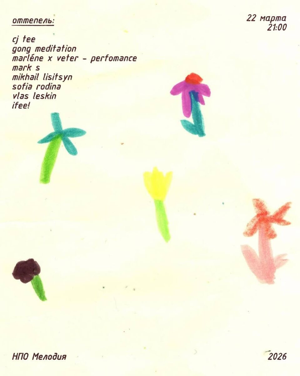 Март 22, воскресенье. Вечеринка «Оттепель» от ребят, которые её придумали. Сюжет такой: заходят как-то раз в бар — ну, точнее, в клуб, — Ifee! и Cj Tee и говорят: «А когда перформанс от Marlen и Veter, в десять вечера, да?» Им Sofia Rodina и отвечает: «Да, а потом я, после полуночи». И следом Vlas Leskin… такой на это посмотрел — и позвал Mark S после себя и Mikhail Lisitsyn на утро. Кстати, на утро ещё и настоящая гонг-медитация назначена — дзи-инь. 🎫 Билеты 📆 22 марта, в 21:00 📍 нпо Мелодия, Москва, 3-я ул. Ямского Поля, 2, корп. 5