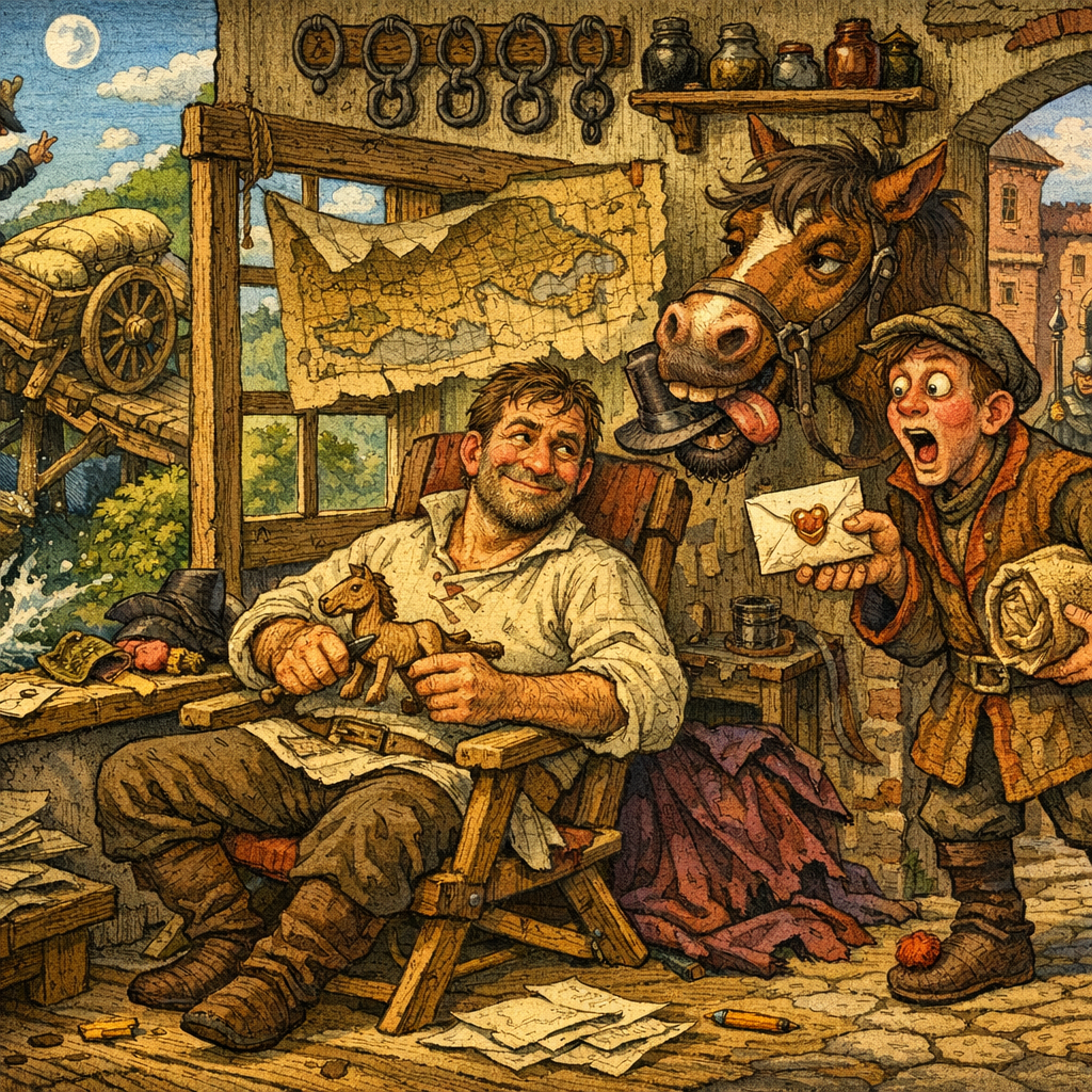 Сейчас Гарольд был одет в простую рубаху и штаны (доспехи висели на специальном манекене в углу и, кажется, дремали). Рядом, на полу, развалившись с самым наглым видом, лежал Брыкун. Конь просунул голову в открытое окно и жевал чью-то забытую на подоконнике шляпу (похоже, цилиндр какого-то заезжего франта). Гарольд не обращал на это внимания — шляпа была уже безнадёжно испорчена, а Брыкун имел право на маленькие лошадиные радости.