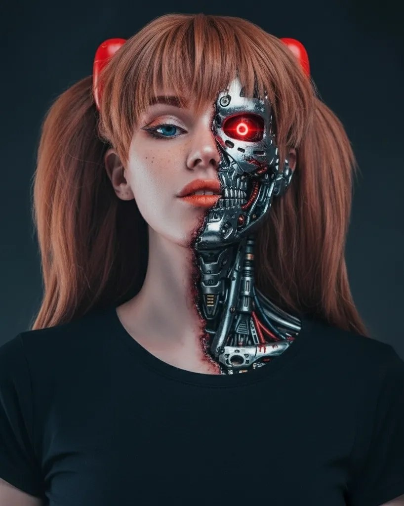 Загрузи свое фото и получи такое же изображение, на котором будешь ты. ✨ Создать фото через сайт ✨ ✨ Создать фото в телеграм боте ✨ Промпт для фото: Создайте фотореалистичный цветной портрет в формате 4:5 по вертикали. На мне черная футболка. Левая сторона моего лица остается человеческой, небольшая часть правой стороны лица, и немного шея, видны как металлический кибернетический эндоскелет с механическими деталями и светящимся красным глазом робота. Переход между кожей и металлом должен выглядеть очень реалистично и естественно - опаленные края кожи, слегка потрескавшаяся ткань, едва заметная засохшая кровь, следы боевых повреждений (не ровная линия разреза). Кинематографическое драматическое освещение, темный мрачный фон,... Все промты для ИИ на нашем сайте и в телеграм канале #реалистичный #кинематографичный #портрет #киберпанк #женщина