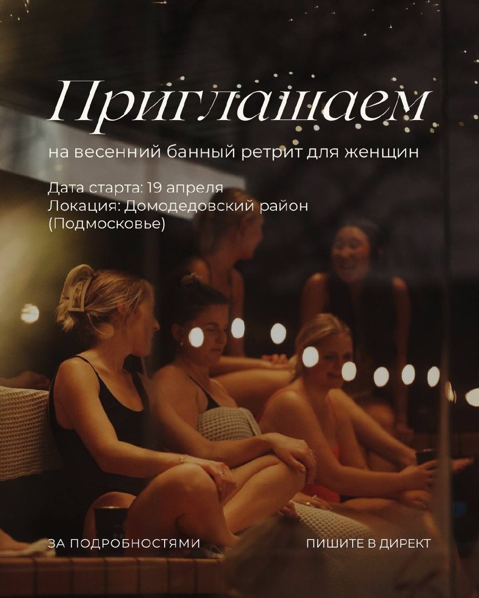 Это пространство про глубокое расслабление на уровне тела и психики. Возможность замедлиться, восстановить контакт с собой, отпустить напряжение и тревогу, вернуть ощущение опоры и внутреннего ресурса. Встреча пройдет в просторной бане в окружении соснового леса (Домодедовский район, ближайшее Подмосковье). ▫️На территории: • баня • подогреваемый уличный бассейн • ароматный чан ▫️Мы собираемся женским кругом, чтобы создать поддерживающее пространство, в котором можно: • расслабиться и восстановиться • побыть в контакте с собой • соприкоснуться со своим ресурсом и состоянием • исследовать свои чувства в безопасной атмосфере ▫️В программе ретрита: • шеринги • телесные практики • парение • работа с четырьмя стихиями: земля, вода, огонь и воздух Традиционно предусмотрен изобильный стол (вегетарианские и не только блюда), а также ароматный чай. Каждая встреча уникальна и не повторяется. Это возможность провести время в замедлении, внимании к себе и восстановлении внутреннего состояния