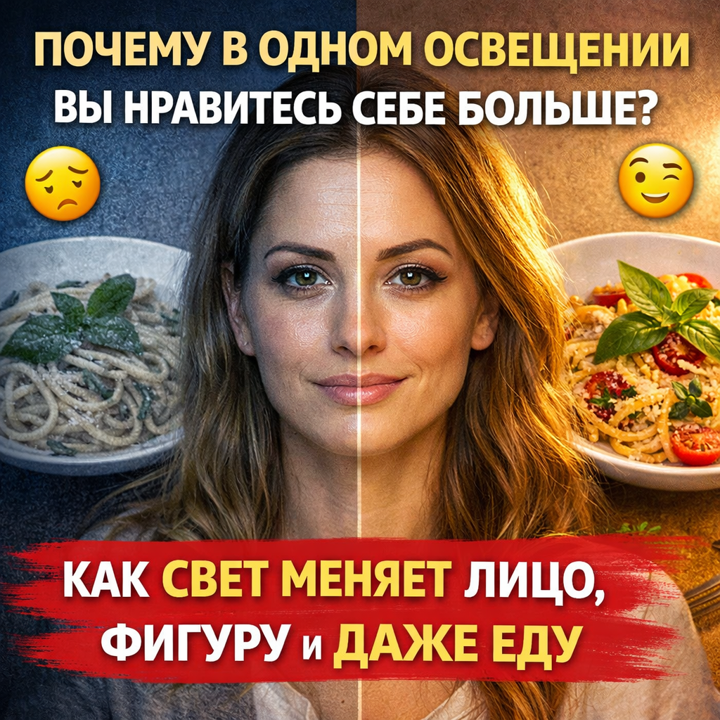 Есть простая вещь, которую многие недооценивают: 👉 свет реально меняет то, как мы выглядим и как воспринимаем всё вокруг. И это не про «кажется» — это физика. Вы точно это ловили: в одной примерочной — фигура ок в другой — уже совсем не то Хотя одежда та же и вы те же. 👉 Разница — в освещении: где-то мягкий и боковой свет где-то жёсткий сверху И он по-разному показывает: рельеф тела текстуру кожи тени И это вообще не случайно. В нормальных кафе и ресторанах свет продумывают: 👉 чтобы: еда выглядела аппетитнее кожа выглядела теплее атмосфера казалась «дороже» Поэтому там чаще всего: тёплый свет мягкое рассеивание нет резкого света сверху 👉 В итоге: лицо выглядит мягче кожа ровнее даже усталость менее заметна А еда — просто выглядит вкуснее. Дома чаще всего всё проще: одна люстра по центру свет сверху обычные лампы 👉 И это даёт эффект: тени под глазами более «жёсткое» лицо кожа выглядит менее ровной И появляется ощущение: