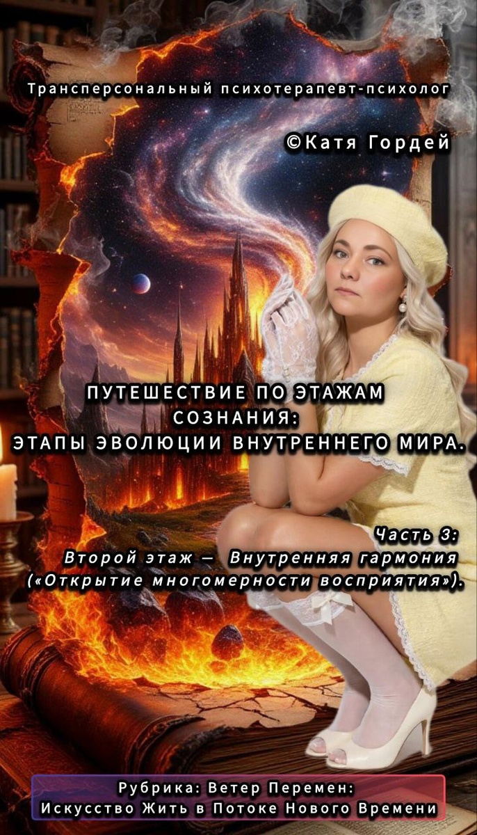 ◼️◼️◼️◼️◼️ 😍Путешествие по этажам сознания: этапы эволюции внутреннего мира. 😍 Часть 3: Второй этаж — Внутренняя гармония («Открытие многомерности восприятия»). Представьте себе второй этаж вашего внутреннего дома — пространство наблюдателя. Здесь вы начинаете понимать, что жизнь не сводится лишь к инстинктам и эмоциям первого уровня. Вы становитесь свидетелем собственных реакций, наблюдая за ними до того момента, пока они вас окончательно не захватили. Этот этап дарит вам осознанность выбора направления и способность видеть взаимосвязи и синхронности вокруг. Однако, эта свобода имеет свою цену. Игнорируя потребности тела и эмоциональные травмы, накопленные ранее, вы рискуете оказаться в плену иллюзий. Например, если ваше сердце жаждет покоя, а разум мечтает о головокружительных приключениях, пытаясь убежать от страха или дискомфорта, ваша энергия быстро истощится. Тело просто откажется поддерживать ваши амбициозные планы, ведь оно нуждается в отдыхе и восстановлении. Таким образ