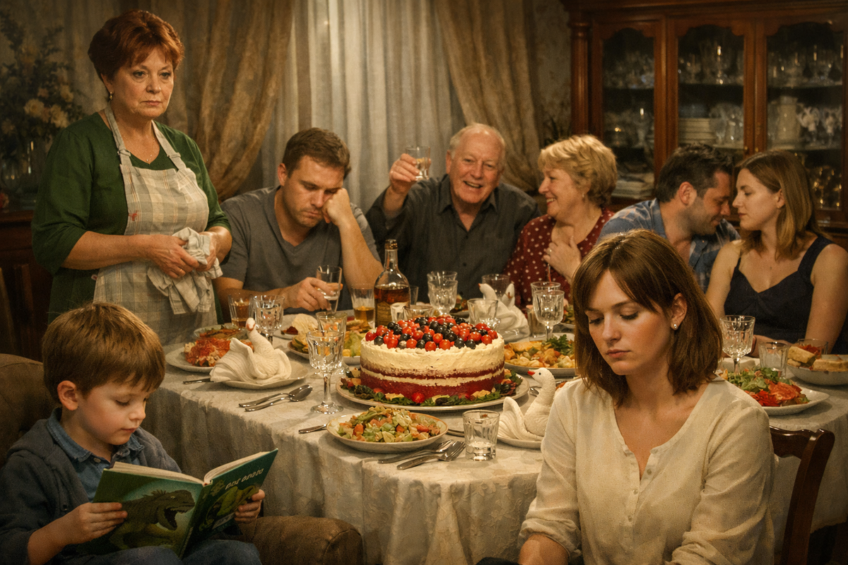 Прошло полчаса. Гости разогрелись, разговорились, тосты стали длиннее, а шутки грязнее. Дядя Коля травил анекдоты про тещу, тетя Зина хихикала, прикрывая рот ладошкой, Андрей обнимал Катю уже совсем по-хозяйски, а та сидела красная, как рак. Нина следила, чтобы Сережа не слышал лишнего, но он уже уткнулся в книжку и, кажется, отключился от реальности, ушел в мир динозавров, где все просто и понятно.
