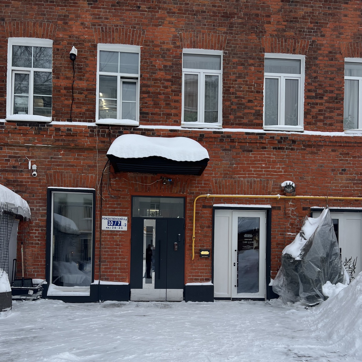 Новый проект «Объект культурного наследия», что появился во дворах Рождественского бульвара, оказался настолько глубоким «объектом русской современной кухни», что по сугробам и льду искать его пришлось минут пятнадцать. Вначале я подумал, что заведение открылось на месте давно ушедшего рыбного ресторана Shell, Yes, – но нет, там винтажный магазин. Пошел искать дальше. Никаких вывесок нет, дополнительных указателей тоже, но, будучи москвичом проворным, полез во дворы и там в дальнем углу наткнулся на небольшое кирпичное здание и малоприметную вывеску.