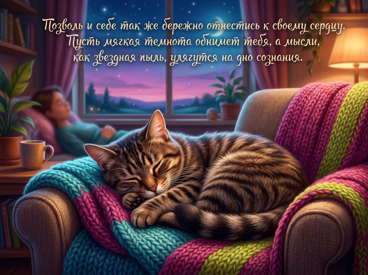 За окном медленно гаснет день, а внутри тебя тоже становится спокойнее. Ты сделал сегодня больше, чем можешь себе признаться, и имеешь полное право просто выдохнуть и доверить остаток дня ночи. Посмотри на меня: я умею останавливаться, тихо сворачиваться в уютный клубок и позволять миру подождать до завтра. Позволь и себе так же бережно отнестись к своему сердцу. Пусть мягкая темнота обнимет тебя, а мысли, как звездная пыль, улягутся на дно сознания. Сегодня ночь сторожит твой покой, а я мысленно лежу рядом и мурлычу невидимую колыбельную. Ты в безопасности. Мир подождет. А сейчас — отдыхай, наполняйся тишиной и доверием к завтрашнему дню.