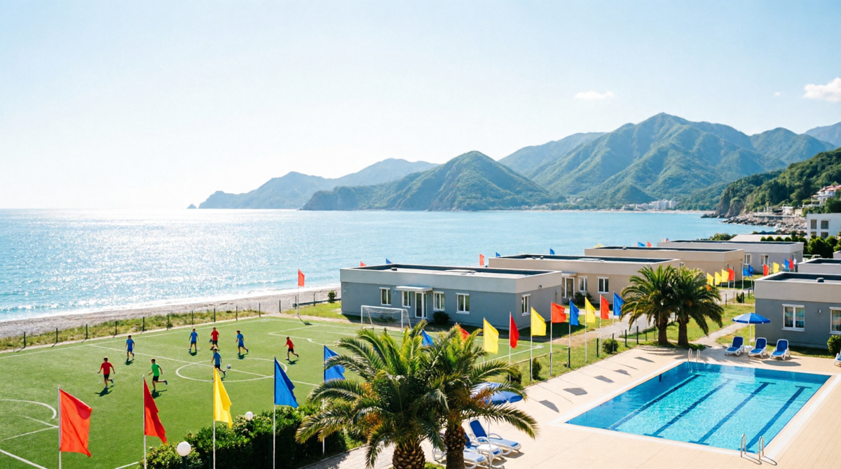 📘 Описание: Футбольный лагерь с академическим подходом для детей от 6 до 18 лет. Тренеры имеют лицензии UEFA-Pro и звание чемпионов России. Программа включает 2 тренировки в день и товарищеские матчи. Проживание организовано в отеле в 800 метрах от моря с полями стандарта УЕФА.