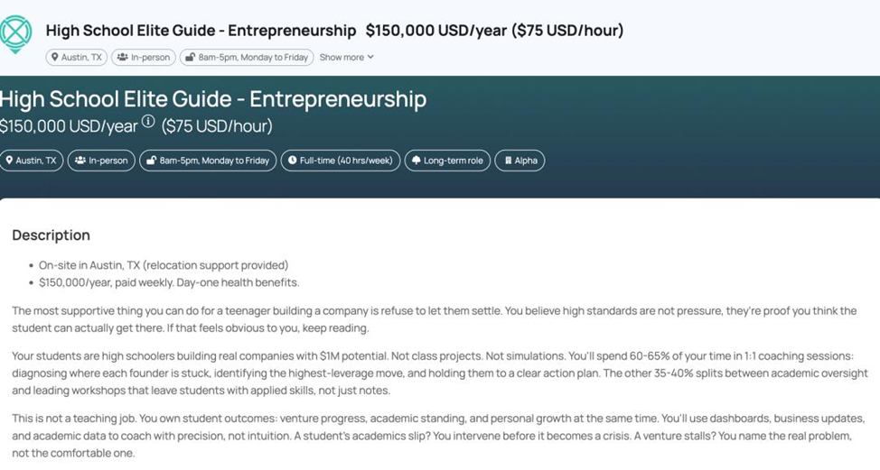 В США вызвала шум в соцсетях вакансия новой «AI‑школы» Alpha School: в офис в Остине (Техас) приглашают 2–3 преподавателя с нестандартной ролью, годовой зарплатой $150 000 и задачей не столько «обучать», сколько лично вести школьников‑основателей до работающего бизнеса. Школа обещает ученикам: «заработать $1 млн до выпуска — иначе вернём плату». Это не уникальный эпизод — он отражает более широкий сдвиг в образовании и подготовке кадров: от лекций к практическим стартап‑инкубаторам и корпоративным траекториям для подростков. Alpha School сокращает формальную учебную нагрузку: ученики якобы проводят в формате традиционных уроков около двух часов в день, остальное — воркшопы и практика. Школа стремится расширяться — в 2026‑м планируется 15 кампусов — и набирает «учителей‑менторов» для очного офиса в Остине. Ключевые особенности вакансии: Главная метрика успеха — коммерческий: помочь школьнику вырастить проект до уровня «миллион долларов». Школа прямо заявляет: «Если не получилось — вернё