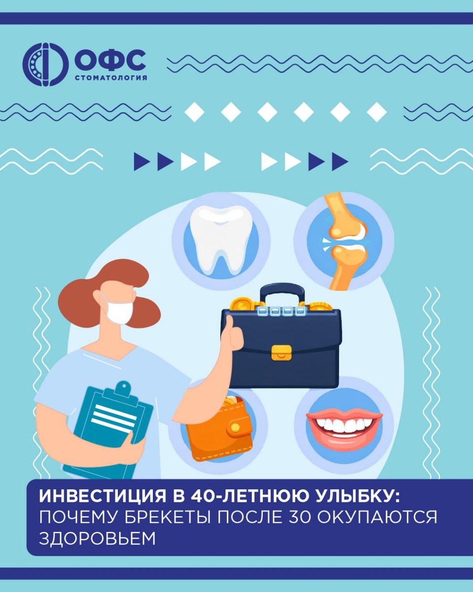 Мы занимаемся инвестированием каждый день. Только разные люди распоряжаются ресурсами по-своему. Время, финансы, наше внимание и любовь – все это мы ежедневно распределяем по сферам, наиболее значимым для нас. В клинике ОФС придерживаются мнения, что лучшая инвестиция – вклад в свое здоровье. Так почему же брекеты после 30 это не прихоть, а выгодное вложение? Конечно, если есть боли в суставе челюсти, повышенная стираемость, частые головные боли без неврологической причины, вопрос о необходимости ортодонтического лечения становится очевидным. А если видимых причин нет? Ну подумаешь, зубы немного криво стоят! ✅️ Экономия на лечении кариеса. При большой скученности труднее прочистить зубы от налета ➡️ образуется кариес (даже если уже лечили зуб, он может появиться снова) ✅️ Профилактика протезирования в будущем. Ортодонтия – верный друг коронок и виниров. Если есть патология прикуса и зубочелюстная система работает "неправильно", выше риск тотального протезирования в дальнейшем. ✅