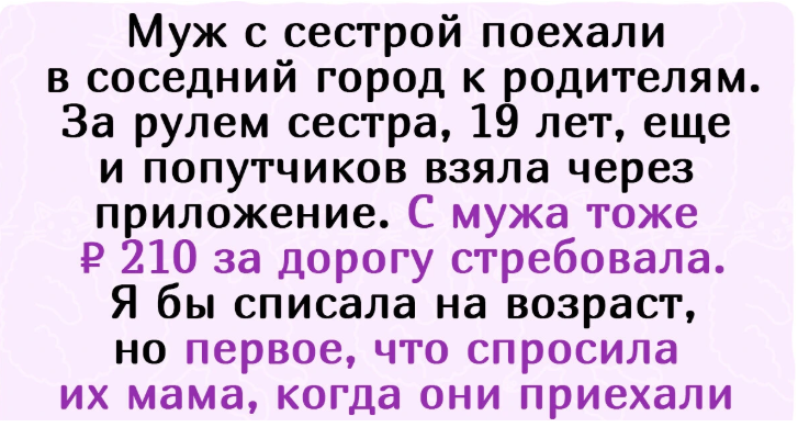 - Муж с сестрой поехали в соседний город к родителям. За рулем сестра, 19 лет, еще и попутчиков взяла через приложение. В конце поездки с мужа тоже ₽ 210 за дорогу взяла. Я бы списала на возраст, но первое, что спросила их мама, когда они приехали: «Ты Ане деньги за дорогу отдал? С тебя ₽ 210!» Кстати, сестра ездит на машине мужа, которую он ей отдал, и я все больше понимаю его нежелание контактировать с родственниками. © Asakavi