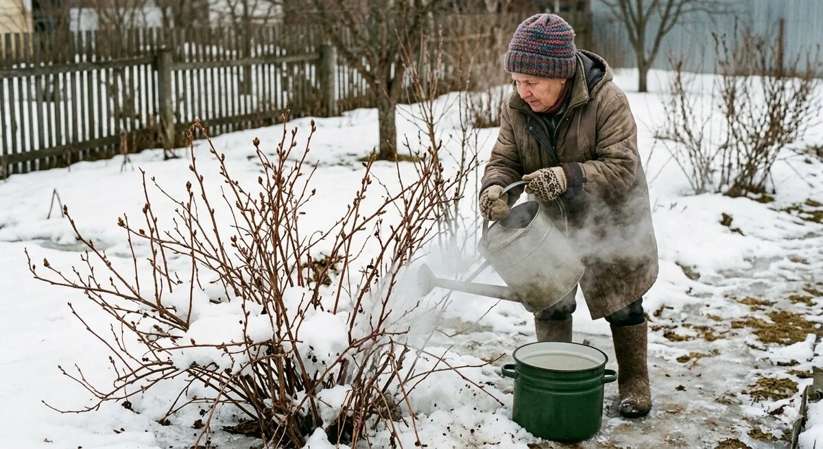 Уважаемые садоводы! Хочу поделиться с вами старинным, но надёжным способом ухода за смородиной — обливанием кустов кипятком. Этот простой, но эффективный метод помогает защитить растения от вредителей и болезней, стимулирует рост и укрепляет иммунитет смородины, что способствует обильному урожаю без использования химических средств. Суть метода заключается в том, что горячая вода уничтожает зимующих вредителей и споры грибков, таких как мучнистая роса, антракноз и септориоз. Она также ускоряет пробуждение почек и рост молодых побегов. Важно выбрать правильное время для обработки. Лучше всего это делать ранней весной, когда снег уже почти растаял, но почки ещё не набухли. Если же почки начали распускаться, обливать кусты кипятком нельзя, чтобы не повредить молодые ростки. Для процедуры вам понадобятся большая лейка с насадкой для равномерного распыления, ведро или кастрюля для нагрева воды и защитные средства для рук. Доведите воду до кипения и дайте ей немного остыть до 85 градусов (