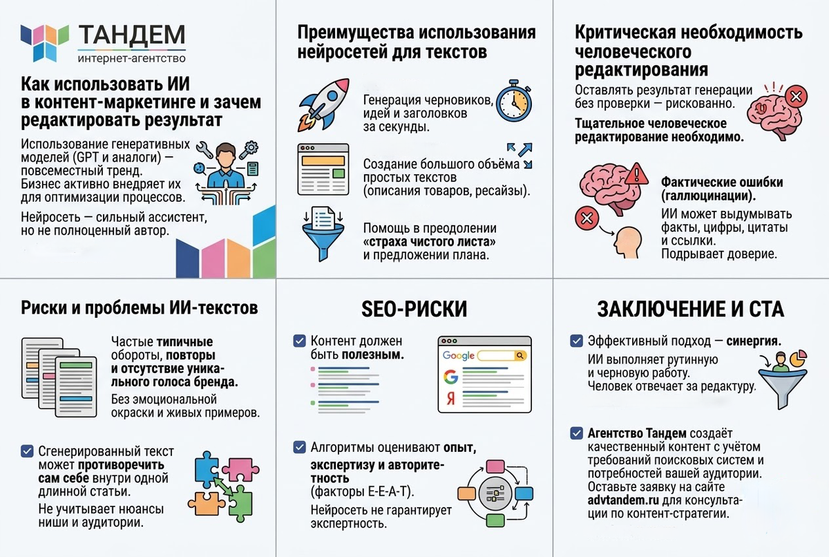 Использование генеративных моделей, таких как GPT и её аналоги, стало повсеместным трендом в создании контента. Бизнес активно внедряет эти инструменты для оптимизации рабочих процессов. Важно понимать: нейросеть является сильным ассистентом, но она не заменяет полноценного автора. Несмотря на плюсы, тексты от нейросетей всегда требуют тщательного человеческого редактирования. Оставлять результат генерации без проверки рискованно по нескольким причинам. Фактические ошибки (галлюцинации). Нейросети обучены генерировать правдоподобный текст, а не проверять его достоверность. ИИ может выдумывать факты, несуществующие цифры, цитаты и даже ссылки на источники. Публикация такой информации подрывает доверие аудитории. Стилистическое однообразие. Тексты ИИ часто страдают от типичных оборотов, частых повторов и отсутствия уникального голоса бренда. У них нет эмоциональной окраски и живых примеров, что делает контент скучным. Проблемы с логикой и контекстом. Сгенерированный текст может противоре