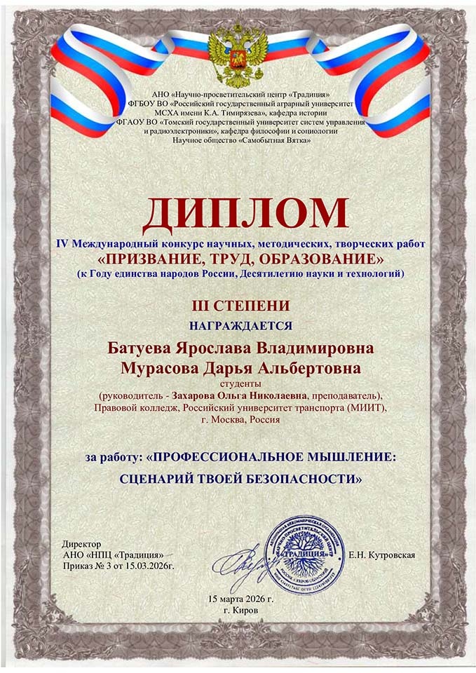 сообщества. Наши студенты заняли почётное третье место. На конкурс они представили видеоролик «Профессиональное мышление: сценарий твоей безопасности». Короткометражный сюжет выполнен в жанре социально‑педагогической