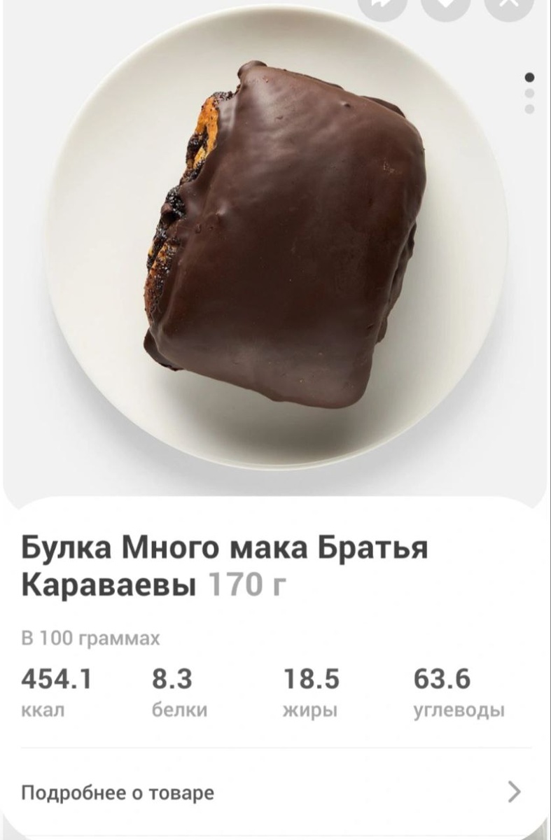 С клиентами мы всегда обсуждаем, как так получается, что вроде ничего не ешь, а вес растёт! Вот показательный пример: Булка с маком - калорийность 454 ккал на 100гр. А весит она 170гр. ➡ Итого 772 ккал на булку😱 Лично мне на день нужно 1600-1700 ккал. Съел булку, и почти половина дневной нормы закрыта. А ведь есть ещё завтрак, обед, ужин, перекусы, кофе... Вот поэтому я и рекомендую клиентам: 1️⃣Минимизировать обработанную еду - в ней калорий очень много, а сытость от неё ненадолго 2️⃣Если полностью отказаться сложно, то придерживаемся стратегии 80/20, где: 3️⃣Смотрите на этикетки! Читаем КБЖУ обязательно Запоминаем: Чем больше в рационе еды промышленного производства, тем выше его калорийность и ниже польза