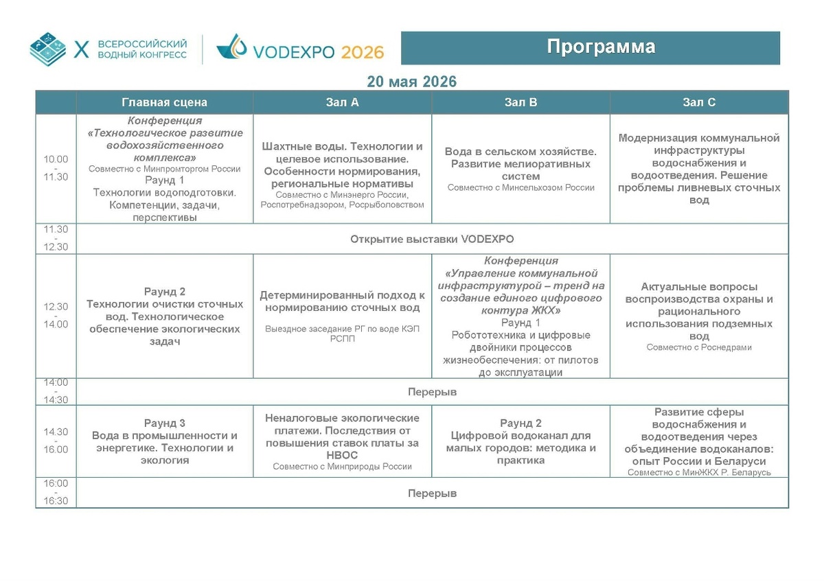Минприроды России, модернизация инфраструктуры водопроводно-канализационного хозяйства и внедрение новых технологий, а также молодёжная научная конференция и пленарная сессия по кадрам и возрождению инженерной школы. ✅ X Всероссийский водный конгресс (http://www.watercongress.ru/) и его выставочная экспозиция VODEXPO 2026 (http://www.vodexpo.ru/) доступны для посещения и участия на бесплатной основе по предварительной регистрации! Присоединяйтесь » (https://reg.watercongress.ru/?utm_source=watercongress&utm_medium=button&utm_campaign=mainpage&utm_term=ru)