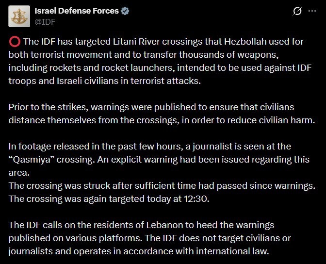 'The IDF does not target civilians or journalists' The Israeli military says an 'explicit warning' was given in the area regarding their 'targeting of Hezbollah'