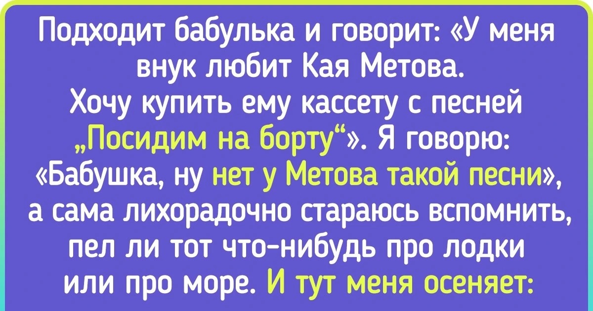 — У меня внук любит Кая Метова. Хочу купить ему кассету с песней «Посидим на борту».