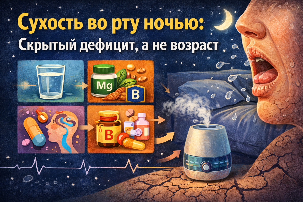 Но сильная сухость — уже сигнал, что что-то нарушено. И чаще всего — это не возраст, а дефициты или сбои в организме. Самая частая и недооценённая. С возрастом чувство жажды притупляется. Человек пьёт меньше, чем нужно, даже не замечая этого. Что происходит: Признаки: 👉 Важно: даже лёгкое обезвоживание уже даёт симптомы. О магнии говорят часто — и не зря. Он участвует: При его нехватке: Часто это сопровождается: Особенно B2, B6 и B12. Они нужны для: При дефиците: Это очень частая проблема после 50. Иногда причина не в дефицитах, а в привычке. Если человек: то слизистая просто пересыхает. И утром появляется: 👉 Это особен