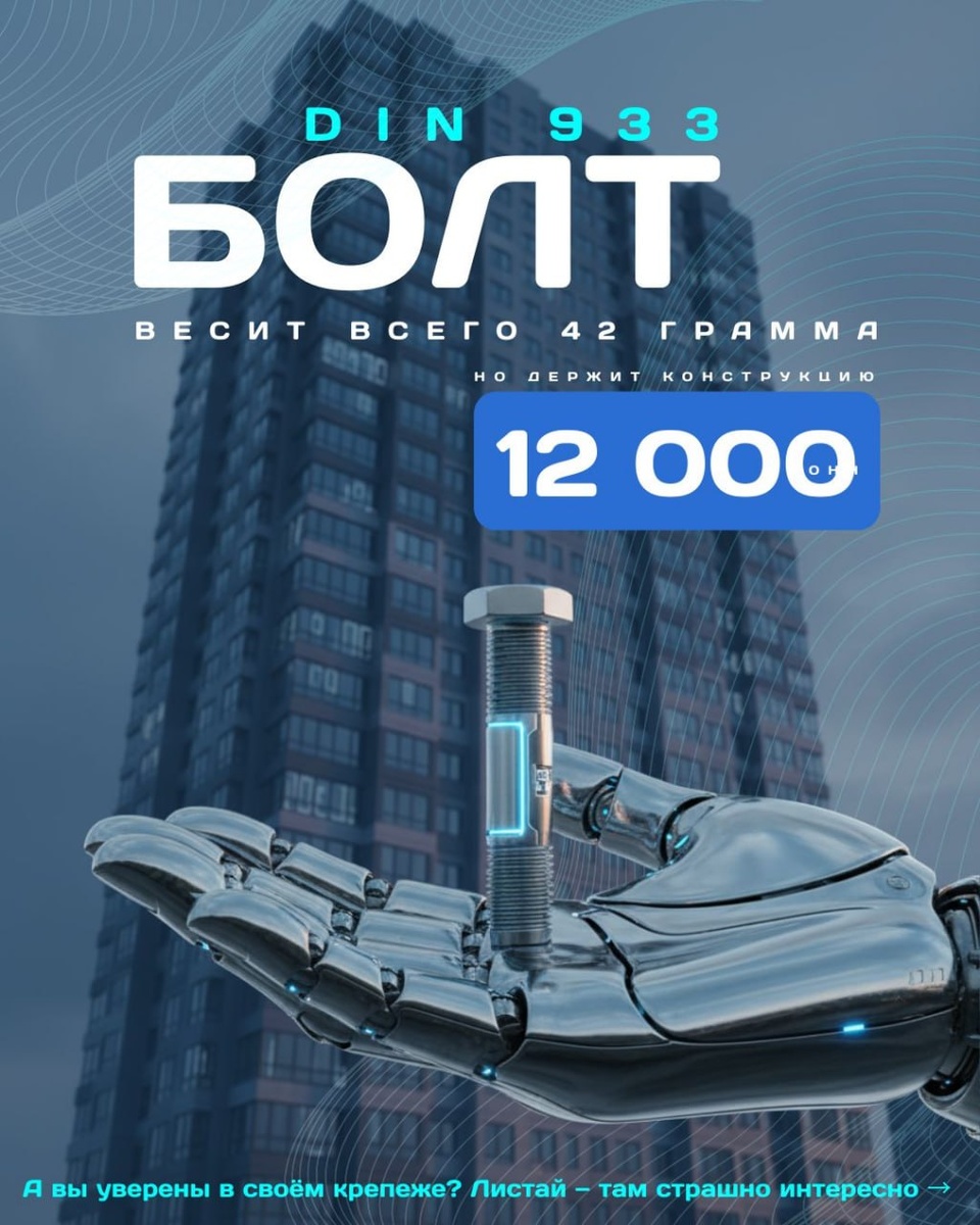 А ВЫ УВЕРЕНЫ В СВОЁМ? 42 грамма стали. Именно столько весит болт DIN 933 М12×60, который держит стальную балку перекрытия в жилом доме. Когда этот болт качественный — о нём никто не думает. Он просто работает. 20 лет. 50 лет. Вечность. Когда этот болт — подделка без сертификата с «выгодной» закупкой — думать приходится всем. Проектировщику. Прорабу. Следователю. НО в oniks-krep работает с крепежом каждый день. И точно знает: разница между надёжным болтом и опасным — это не цена. Это поставщик. 📲 Отправляй и ты свою заявку на надёжный крепёж по DIN|ISO|ГОСТ в t.me/oniks_krep_bot А шпаргалку👉🏻 сохраняй 🔖 и пересылай коллегам 📩