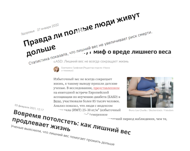 И вот уже лишний вес вдруг превращается чуть ли не в защитный фактор, а булочки — в союзников здоровья.