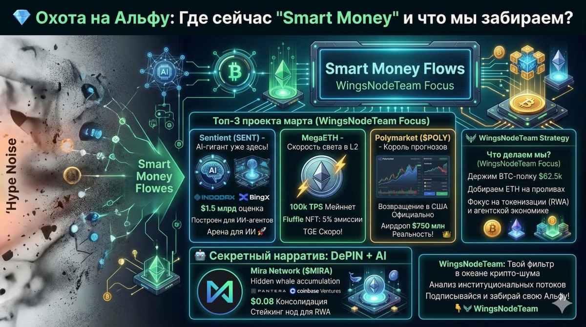? Продолжаем наш разбор. Если первый пост был про "почему всё падает", то этот - про то, как на этом заработать. В 2026 году деньги делаются не на хайпе, а на инфраструктуре. ℹ️ Топ-3 проекта марта (WingsNodeTeam Focus): 🟢 Sentient (SENT) - AI-гигант уже здесь! Аирдроп заклеймлен, листинги на INDODAX и BingX прошли. Оценка в $1.5 млрд оправдана - ребята строят Arena для ИИ-агентов. Если пропустили первый сезон - готовьтесь ко второму. Это главный нарратив года. 🟢MegaETH - Скорость света в L2 Мейннет запущен, 100k TPS - это не шутки. TGE ожидается со дня на день. Держатели Fluffle NFT - вы в шоколаде, 5% эмиссии ваши. Остальным советуем не спать и крутить активности в экосистеме. 🟢 Polymarket ($POLY) - Король прогнозов Тикер зарегистрирован, возвращение в США официально. Аирдроп на $750 млн - это реальность. Если вы активничали на платформе с 2024-го - ждите жирный куш. 👉 Секретный нарратив: 😀 DePIN + AI Обратите внимание на Mira Network ($MIRA). Пока цена в консолидации (