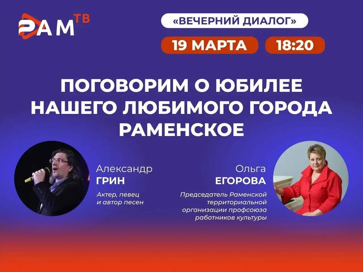 территориальной организации профсоюза работников культуры Ольга Егорова. 🎉Поговорим о юбилее нашего любимого города Раменское. Не пропустите самое интересное! ➡️Трансляция будет доступна: • на телеканале «Раменское телевидение» • в ВКонтакте • на сайте Раменского телевидения #РамТВ_прямая_трансляция