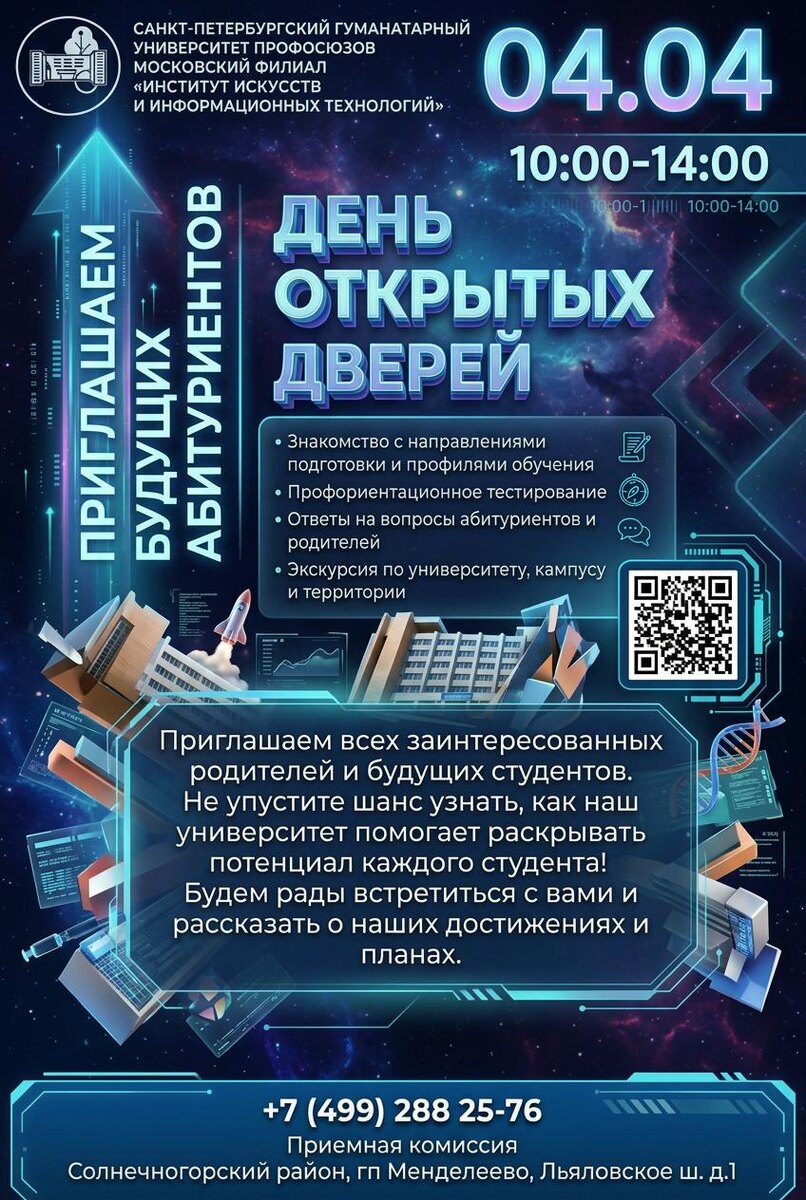 04.04 10:00 - 14:00 ℹ️ Узнайте больше о поступлении, программах обучения и студенческой жизни Санкт-Петербургского Гуманитарного университета профсоюзов "Институт искусств и информационных технологий" ✅ Вас ждёт насыщенная программа: - Знакомство с направлениями подготовки и профилями обучения - Консультации приёмной комиссии и заведующих кафедрами - Экскурсия по университету, кампусу и территории - Для гостей будут работать кафе-столовая и буфет ➕ Зарегистрироваться: msk-gup.ru/day5 #Зеленоград #СПбГУП #ИИиИТ #Институт #Образование #Химки #Клин #Солнечногорск #Куркино #Менделеево #Лунёво #Фирсановка