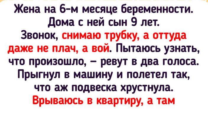 - Жена на 6-м месяце беременности. Дома с ней сын 9 лет. Я на работе. Звонок, снимаю трубку, а оттуда даже не плач, а вой. Пытаюсь узнать, что произошло, — ревут в два голоса. Прыгнул в машину и полетел так, что аж подвеска хрустнула. Залетаю во двор, врываюсь в квартиру, а там они сидят такие на диване. Грустные. Оказывается, разбили монитор (уронили его со стола). Как я орал! Я, пока ехал, сам чуть не родил. Позвонил на работу, там тоже паника, поскольку они тоже слышали, как там выли в трубку, и наблюдали за тем, как я улетел с парковки. Объяснил ситуацию и сказал, что сейчас приеду. Шеф сказал, мол, сиди уже дома, завтра выйдешь © Tissay